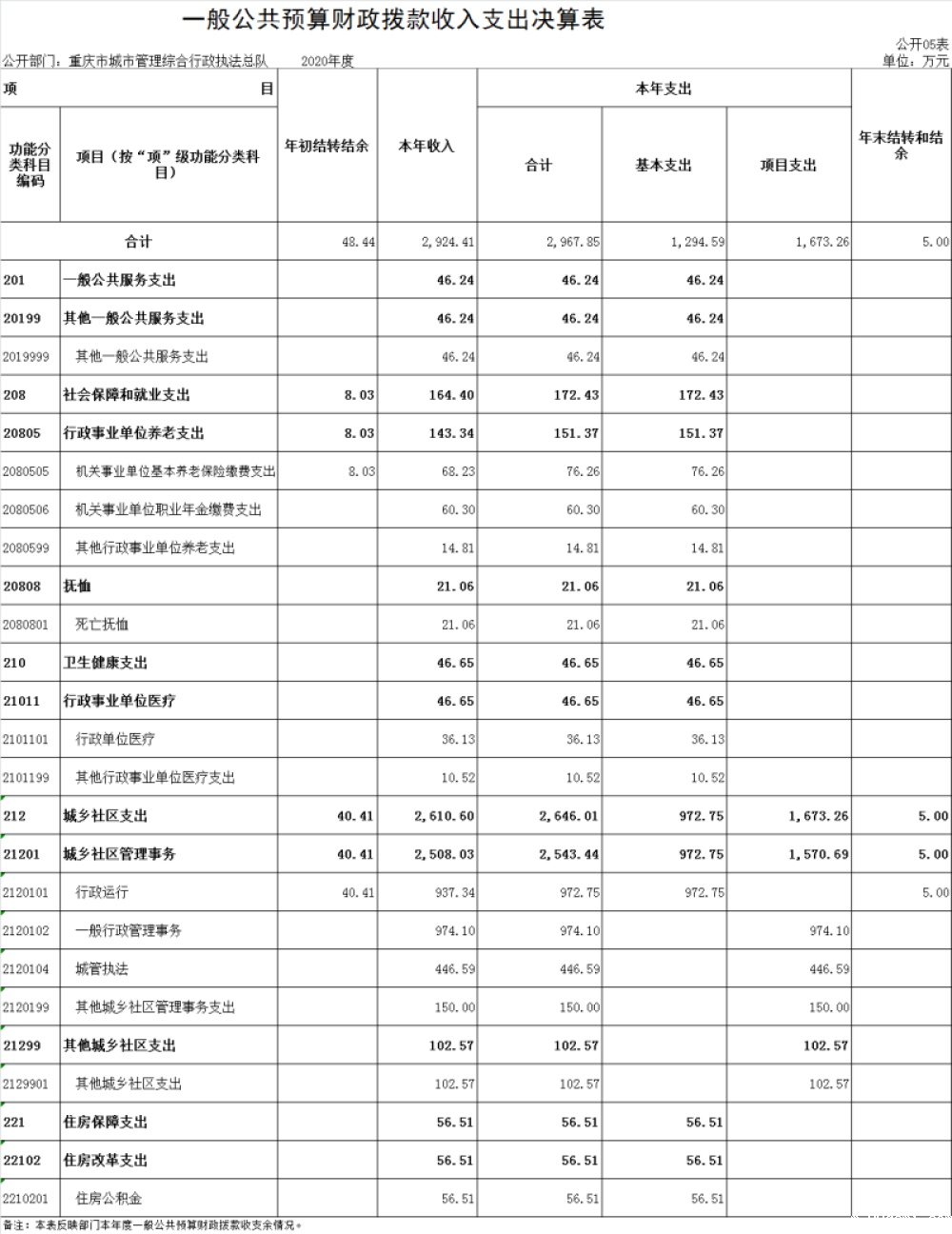 1.总体情况。2020年度收入总计2,994.78万元,支出总计2,994.78万元。收支较上年决算数增加960.35万元, 增长 47.2%,主要原因是根据重庆市机构改革统一安排,总队增加了中心城区规划城镇建设用地范围内城市违法建筑执法工作职责和增人增资,导致城乡社区支出、一般公共服务支出、社会保障和就业支出、卫生健康支出、住房保障支出等同时增加。本部分收入总计包括收入合计、使用非财政拨款结余、年初结转和结余;支出总计包括本年支出合计、结余分配、年末结转和结余。